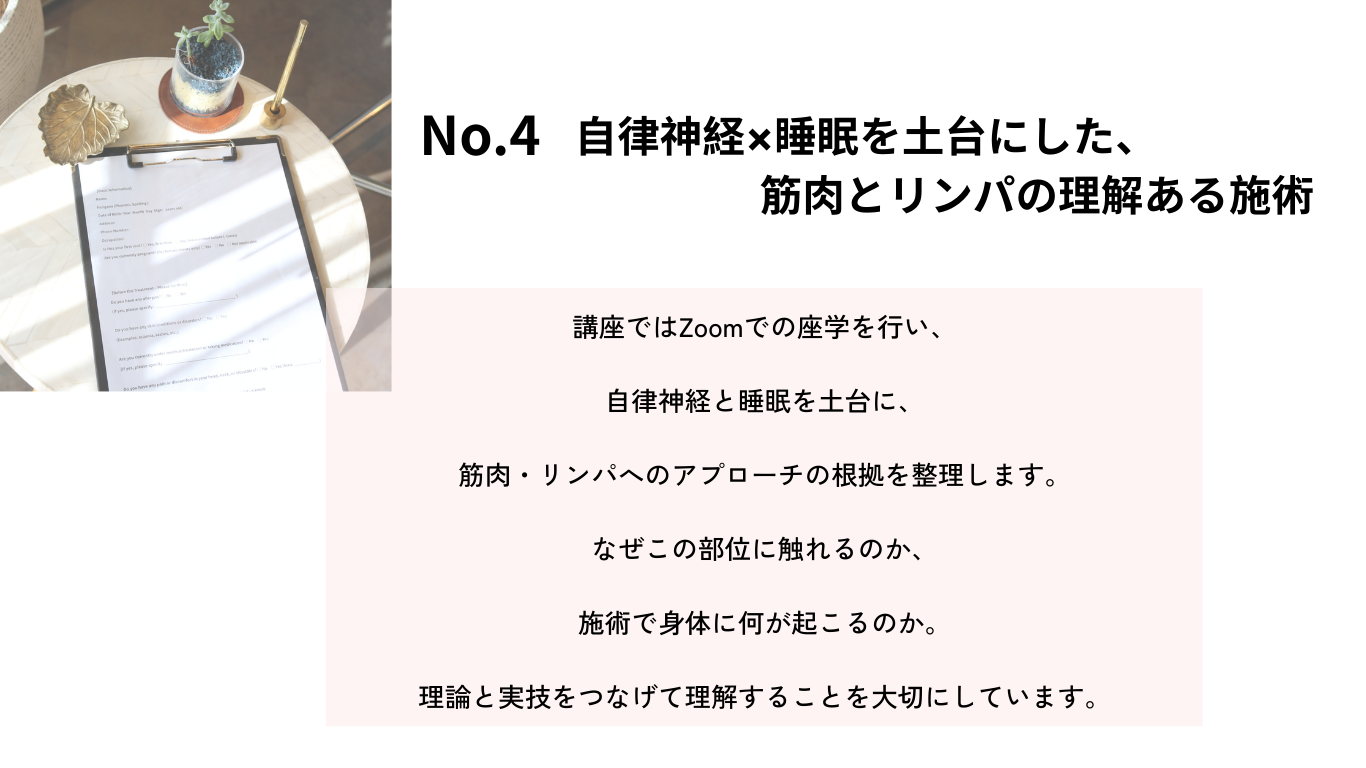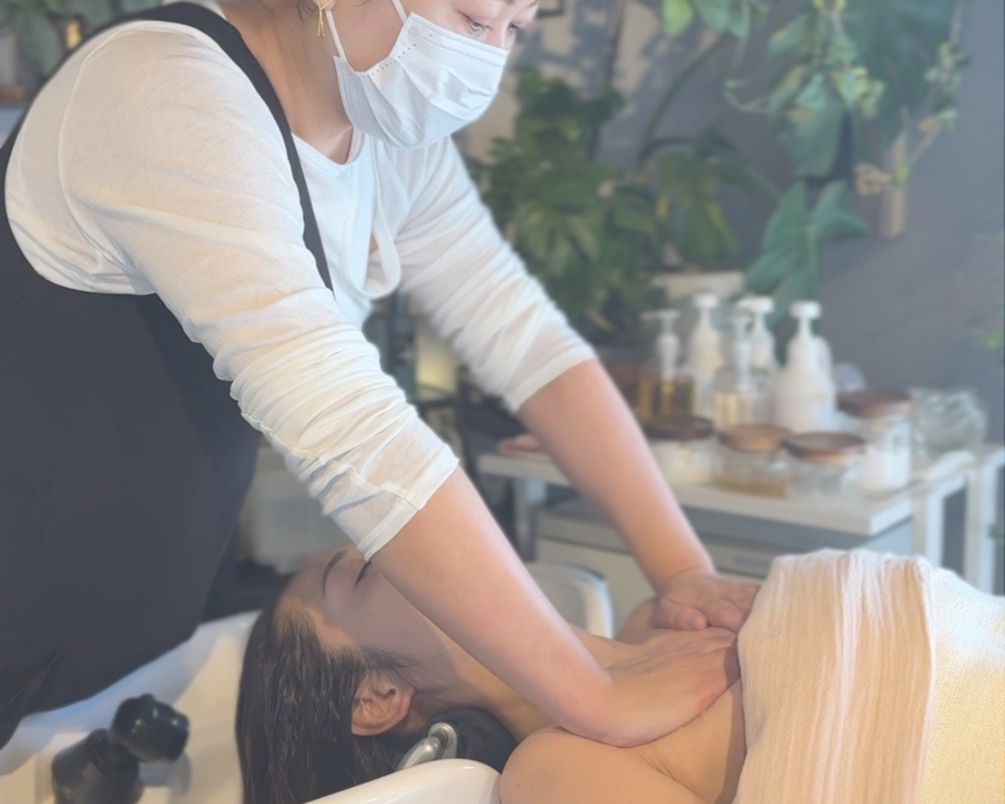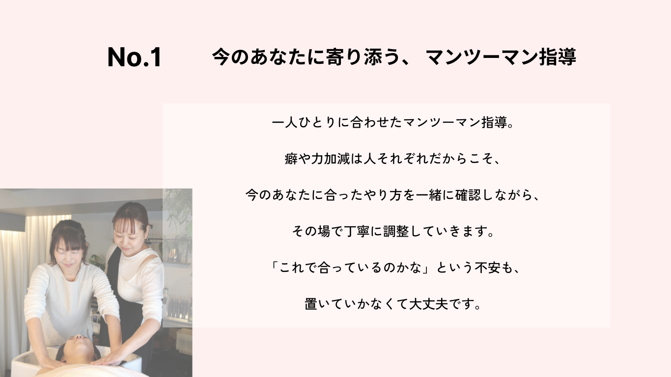 当サロンオリジナルメソッドとして、ヘッドスパと自然につながる上半身施術を組み込み、一連の流れとして提供できる技術を身につけていきます。