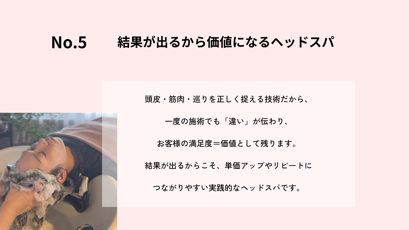 短時間でも、「軽さ」「深いリラックス」「整った感覚」を引き出せるため、満足度の高いヘッドスパとして、無理なくリピートにつなげることができます。