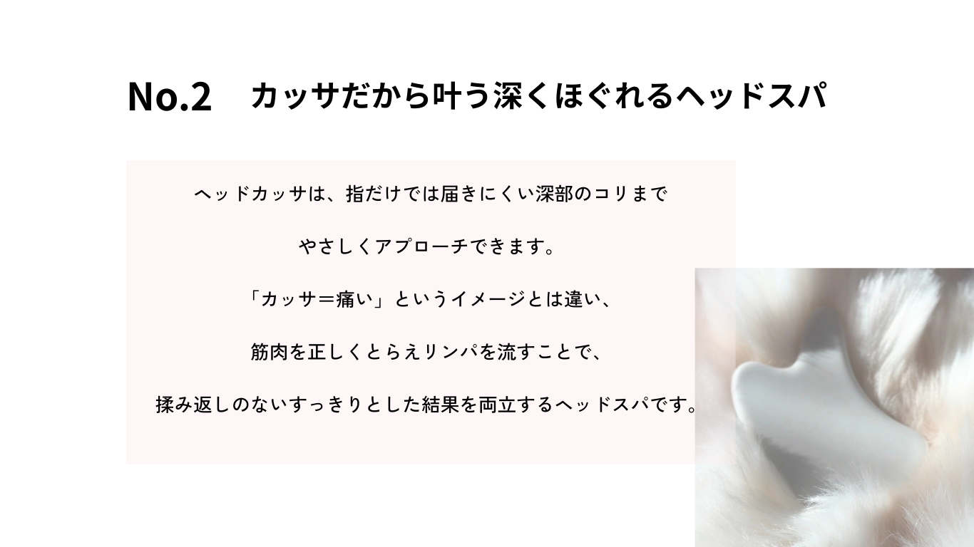 ヘッドスパ単体では届きにくい部分までアプローチすることで、体感・満足度・持続力を高めたコース提供が可能になります。