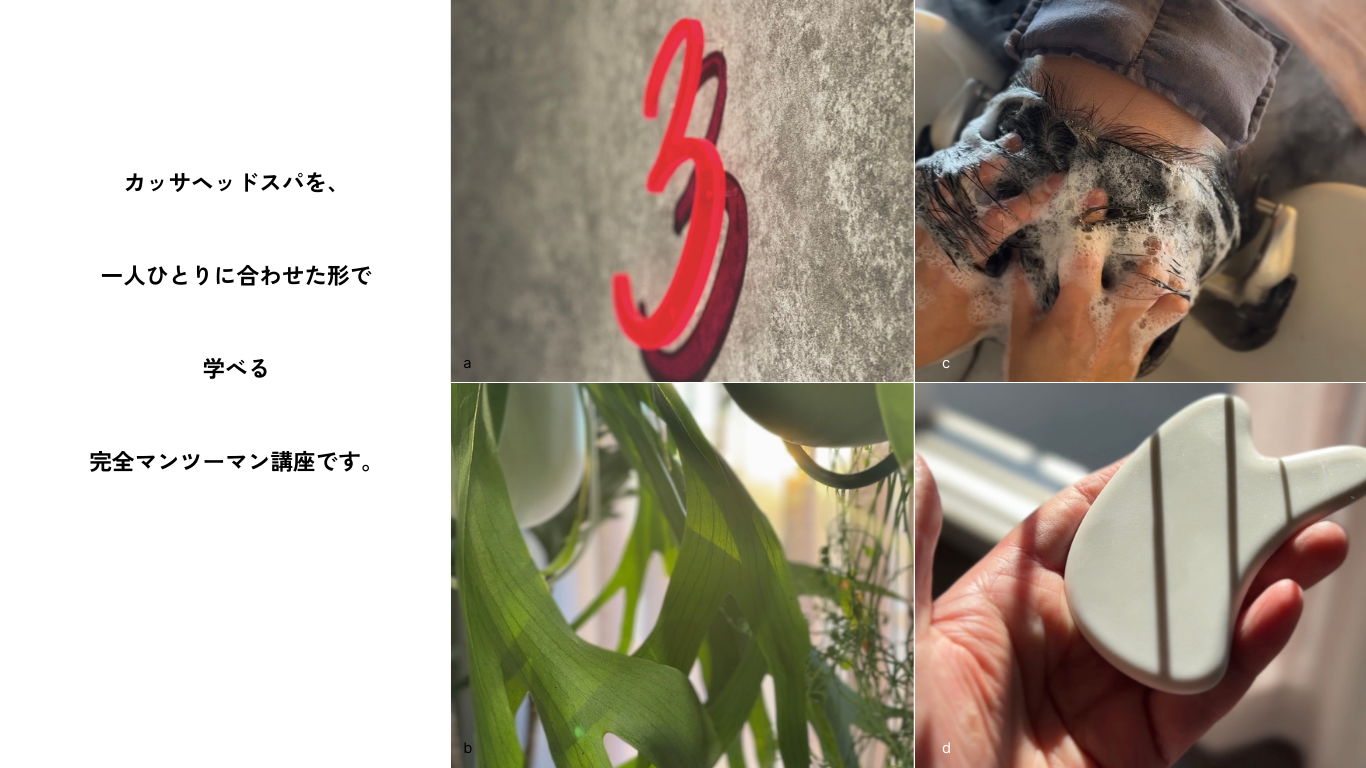 座位でのハンドテクニックで頭皮をゆるめ、シャンプー台でカッサヘッドスパを行い、最後に頭皮と全体のバランスを整えるハンドテクニックまで、サロンでそのまま使える完成形の流れを習得していきます。
