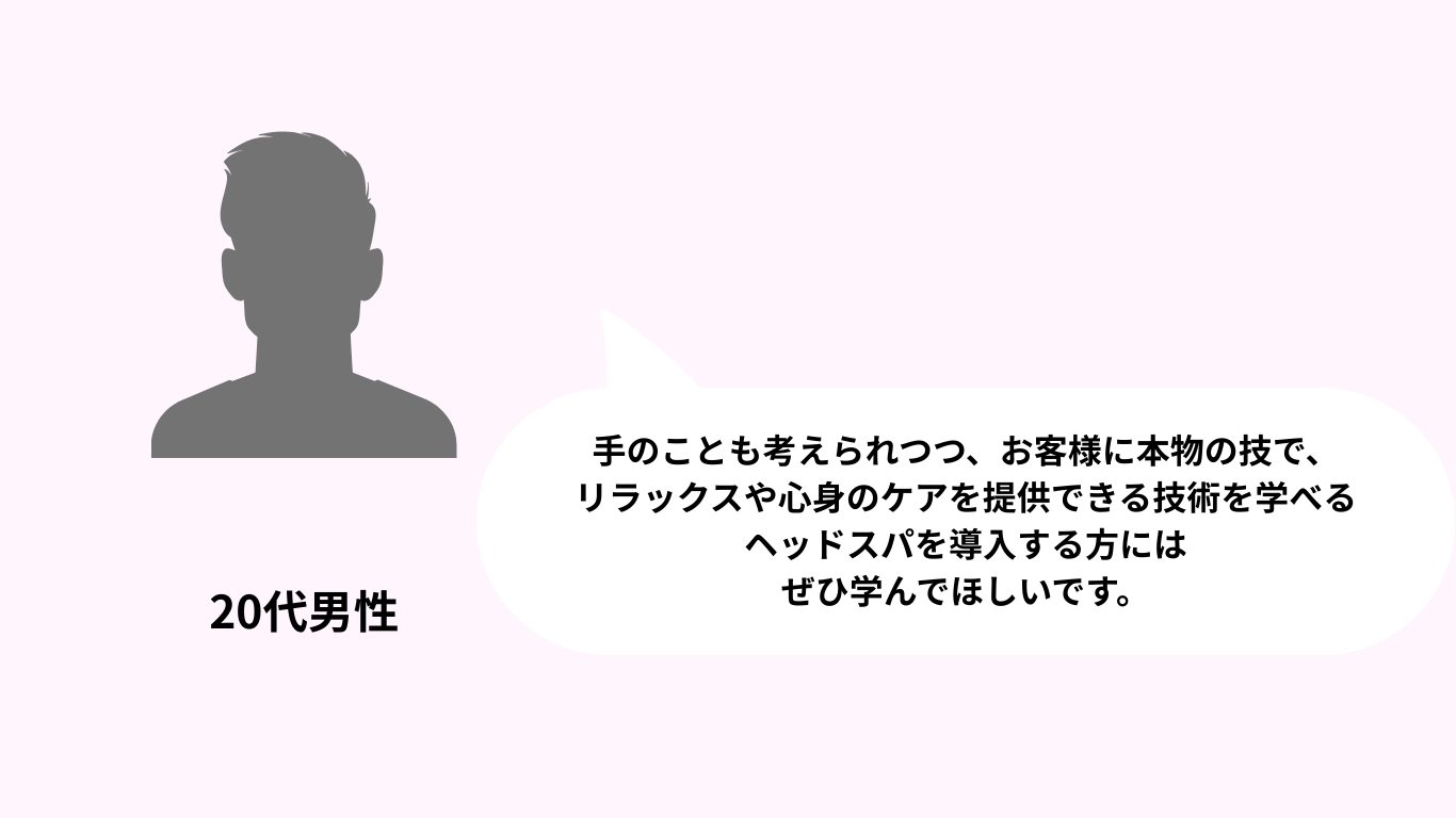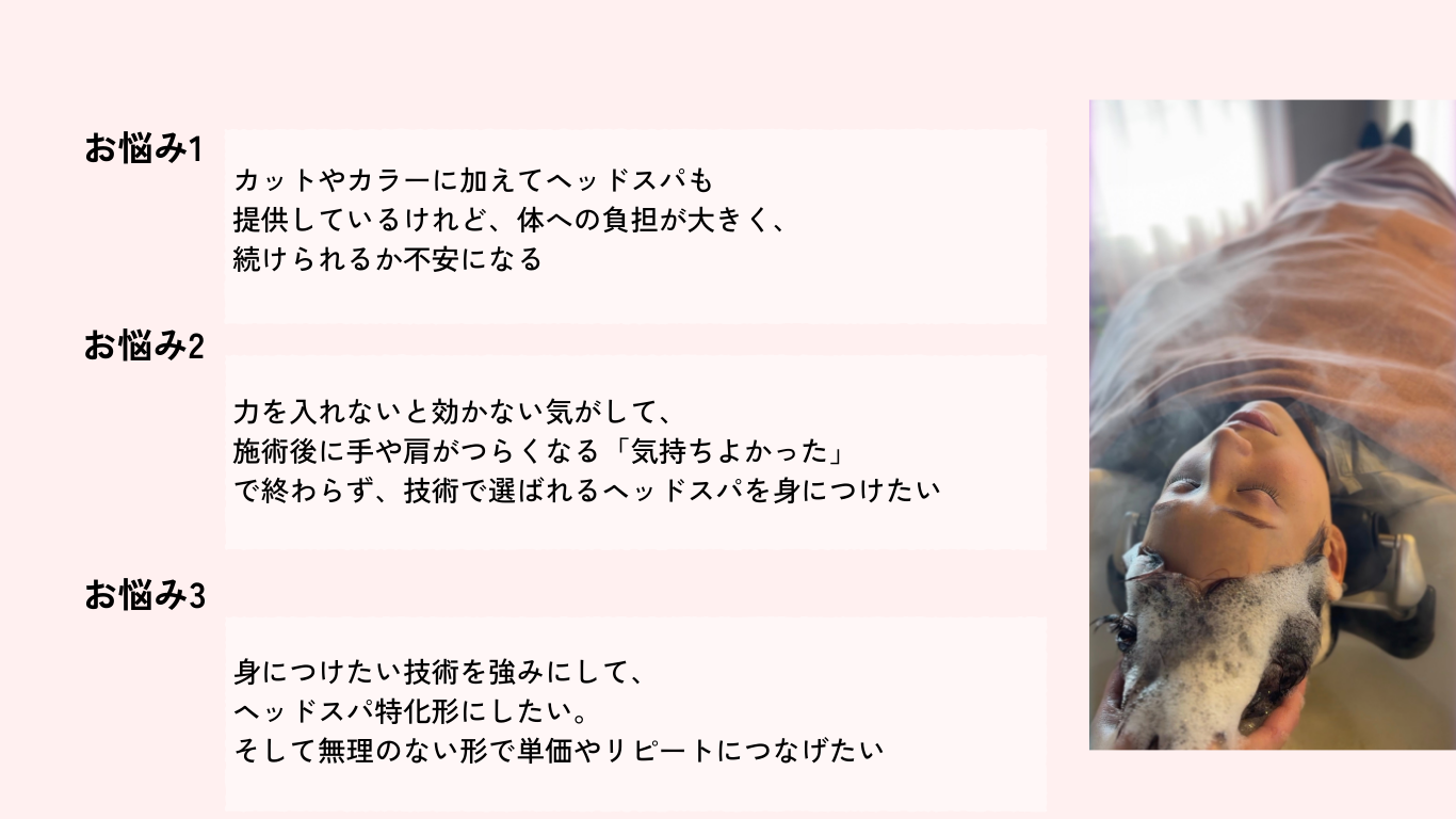 「ヘッドスパを主軸に、他と差別化できる強みのあるメニューを作りたい方」におすすめの講座です。